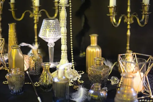 Assortment of golden decanters